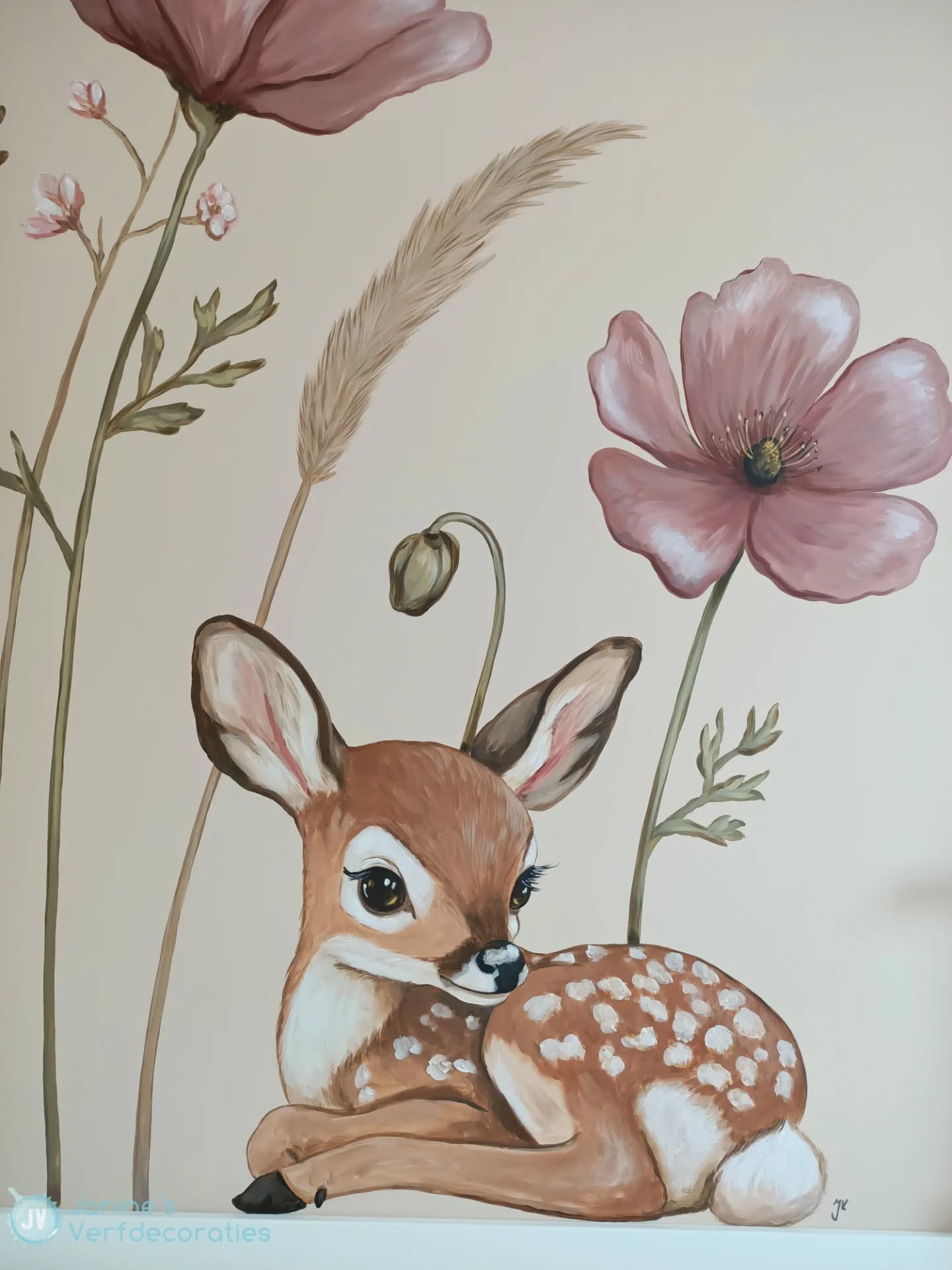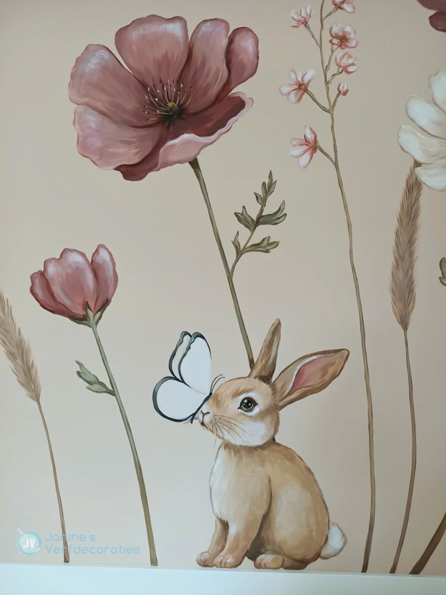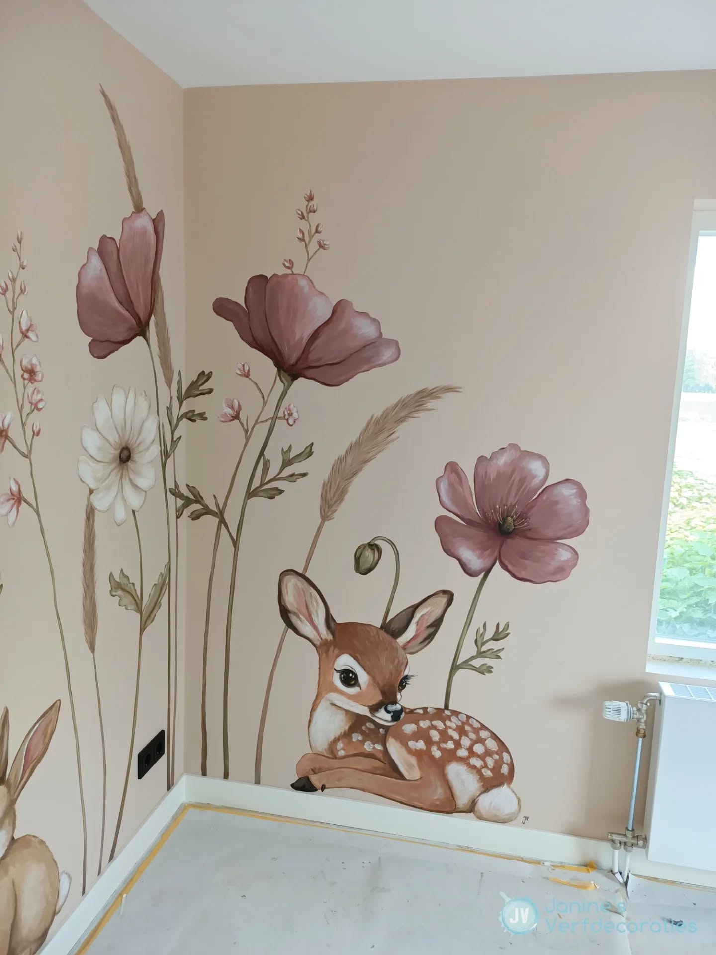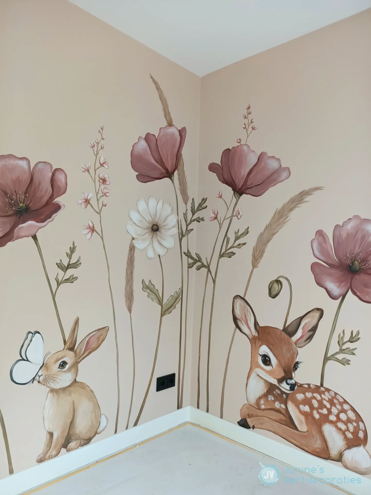 #kinderkamerinspiratie #interieurinspiratie #interieurstyling #kamermetamorfose #interieurdetails #knuskamertje #janinesverfdecoraties #jv #muurschildering #meisjeskamer #meidenkamer #oudroze #zalm #bloemen #hertje #konijntje #vlinders #mus #goud #naam