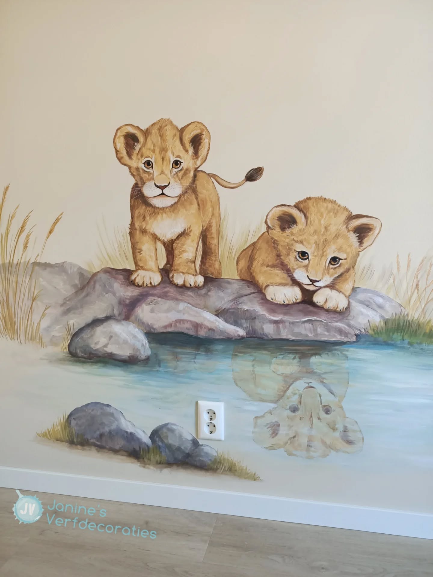 Omdat het stel zo van reizen houdt, mocht ik dit verwerken in een speels tafereel met een grote boom en allerlei dieren: een giraf, een schattige panda, een toekan, een lief aapje en twee welpjes – waarvan er één nieuwsgierig naar zijn eigen spiegelbeeld in het water kijkt 🐾